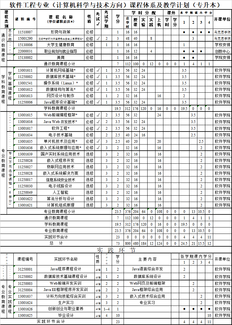 主要实践教学环节包括:Java程序课程设计、数据库技术基础课程设计、Web前端开发实训、Java EE框架程序开发实训、专业综合实训、生产实习、毕业设计。
